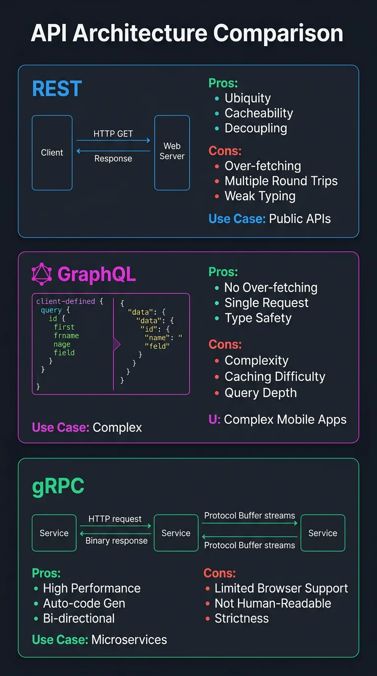 Side-by-side comparison of REST, GraphQL, gRPC, and WebSocket APIs with use cases, pros and cons, and a decision guide