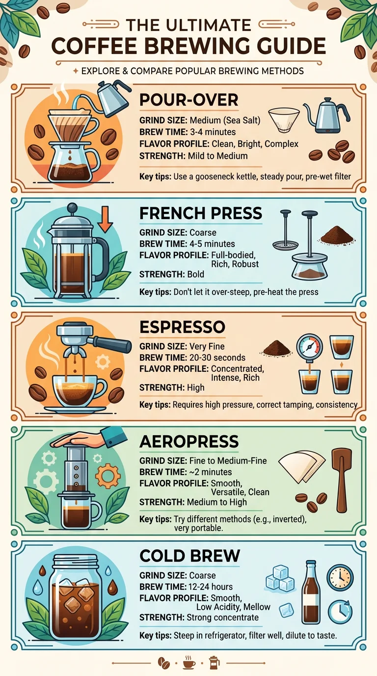 Side-by-side comparison of pour-over, French press, espresso, AeroPress, and cold brew with brew times, grind sizes, flavor profiles, and a decision tree to find your perfect method