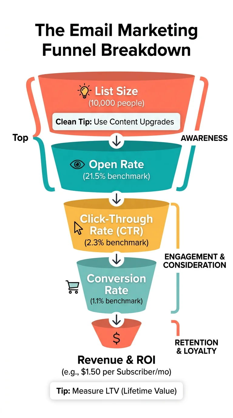 Visual funnel showing email campaign performance from list size to opens, clicks, conversions, and revenue with benchmarks at each stage