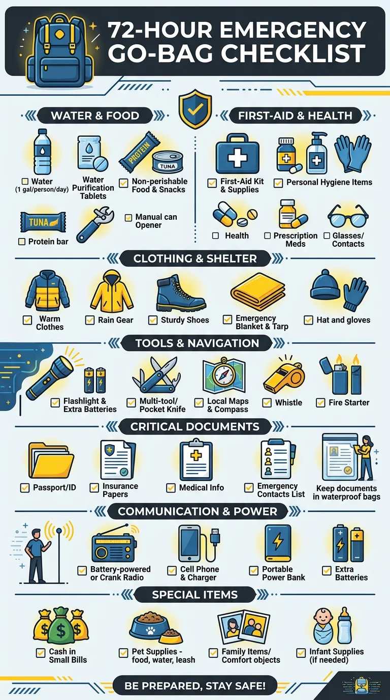 Complete categorized checklist for building a 72-hour emergency go-bag with water, food, documents, first aid, tools, and personal items