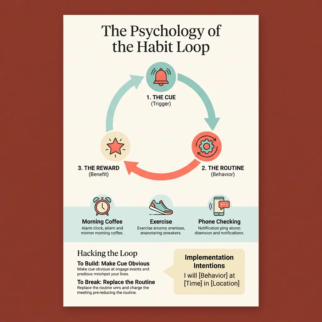 Behavioral psychology diagram of the cue-routine-reward loop with real-world examples and strategies for building good habits