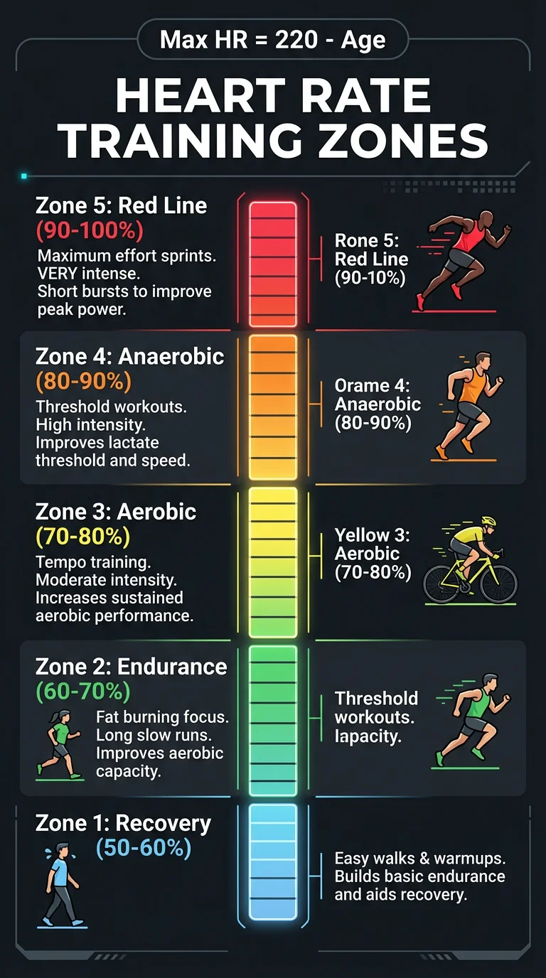 Visual guide to 5 heart rate zones for runners and cyclists with target percentages, example workouts, and how to calculate your max HR
