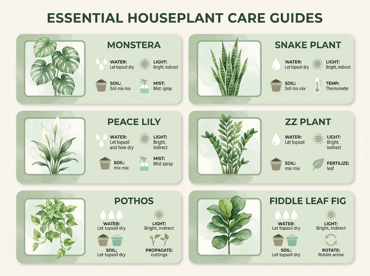 Care cards for 6 popular indoor plants covering light needs, watering frequency, difficulty rating, and essential care tips