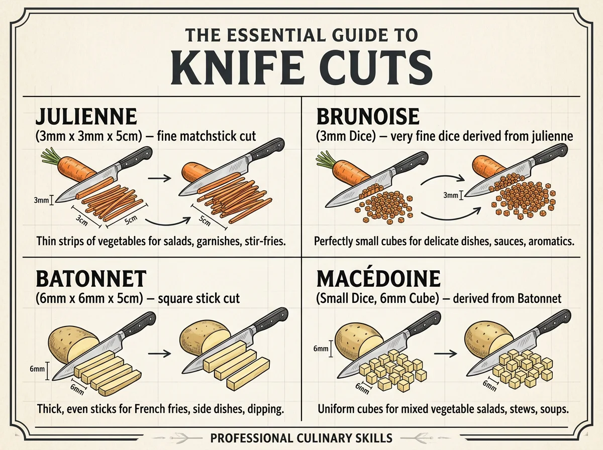 Visual guide to essential knife cuts including brunoise, dice, julienne, chiffonade, and mince with measurements and best uses