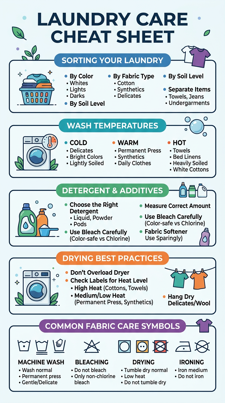 Visual cheat sheet explaining all common laundry care symbols for washing, bleaching, drying, ironing, and dry cleaning with plain-English meanings