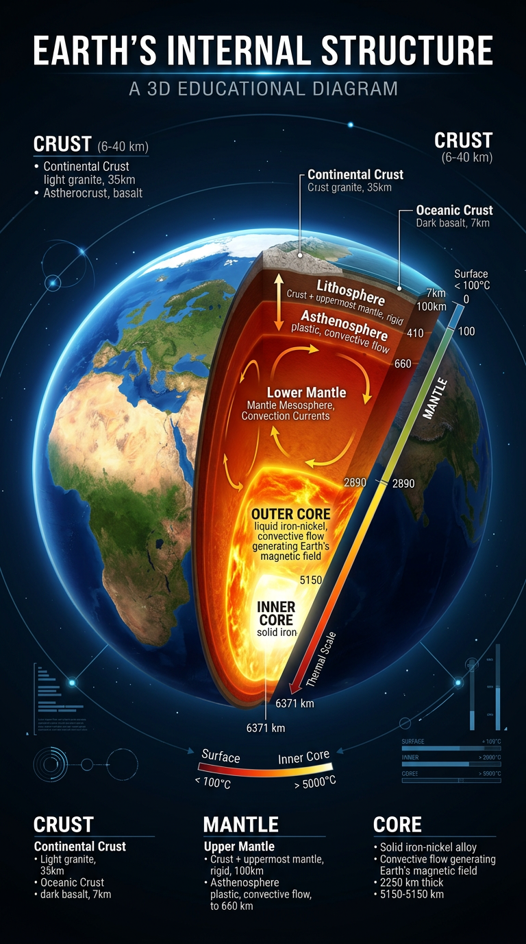 Cross-section diagram showing Earth's crust, mantle, outer core, and inner core with thickness, temperature, composition, and state of matter for each layer