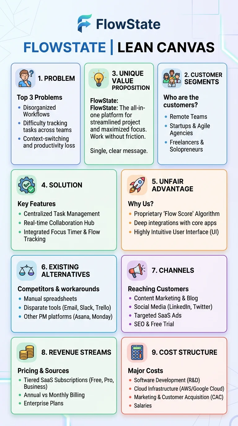 Visual template of the Lean Canvas framework with all 9 blocks explained including problem, solution, key metrics, unfair advantage, and revenue streams