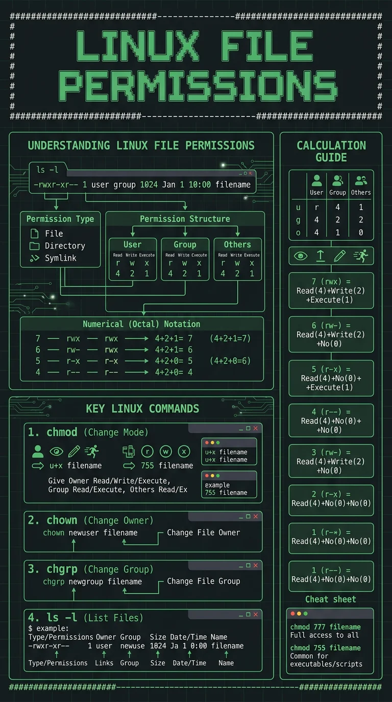 Visual guide to Unix file permissions showing rwx notation, octal codes, chmod commands, and ownership with real examples for common scenarios