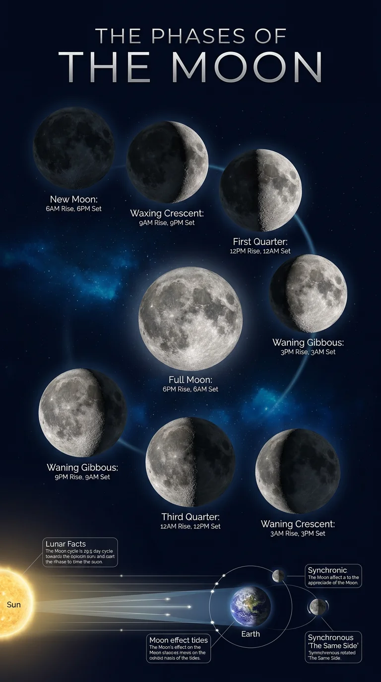Visual timeline of the 8 lunar phases over a month showing waxing and waning stages with illumination percentages, rise and set times, and key astronomy facts