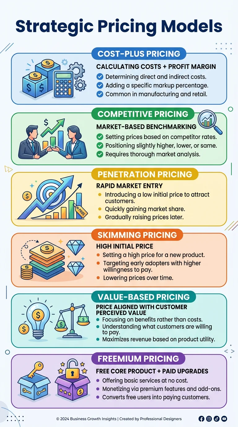 Comparison of 6 common pricing strategies including cost-plus, value-based, competitive, freemium, penetration, and skimming with when to use each