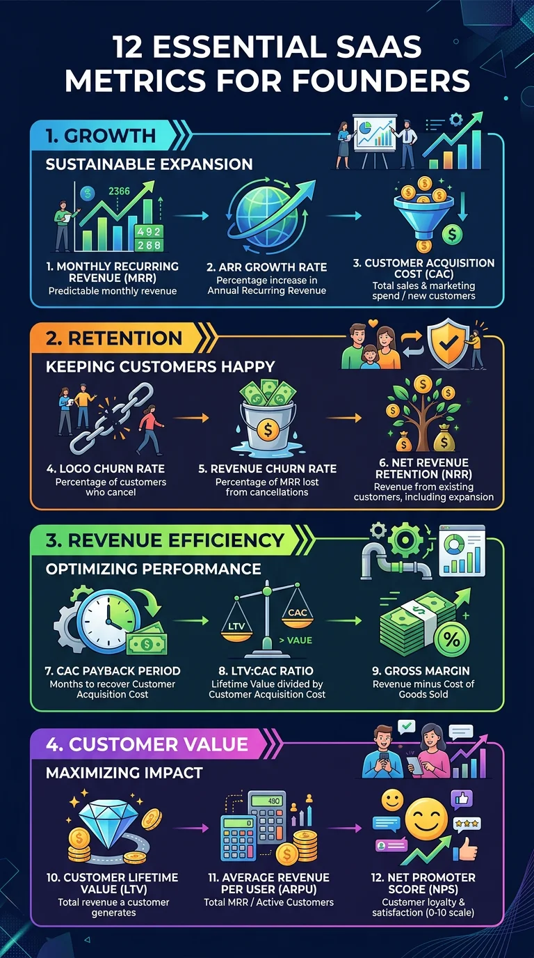 The 12 key SaaS metrics every founder should track including MRR, ARR, churn, LTV, CAC, burn rate, and runway with formulas and healthy benchmarks