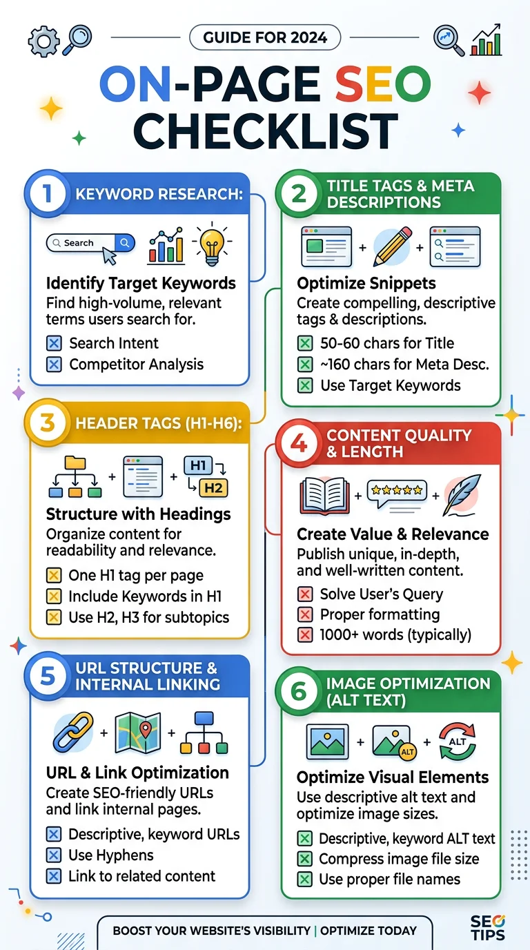 Complete checklist for optimizing web pages covering title tags, meta descriptions, headings, image alt text, internal links, and Core Web Vitals