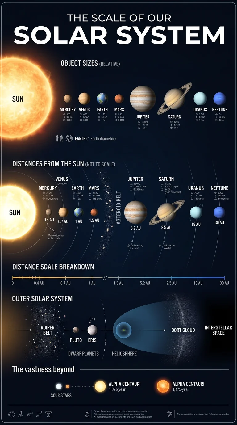 All 8 planets with relative sizes, distances, orbital periods, fun facts, and size comparisons between Earth, Jupiter, and the Sun