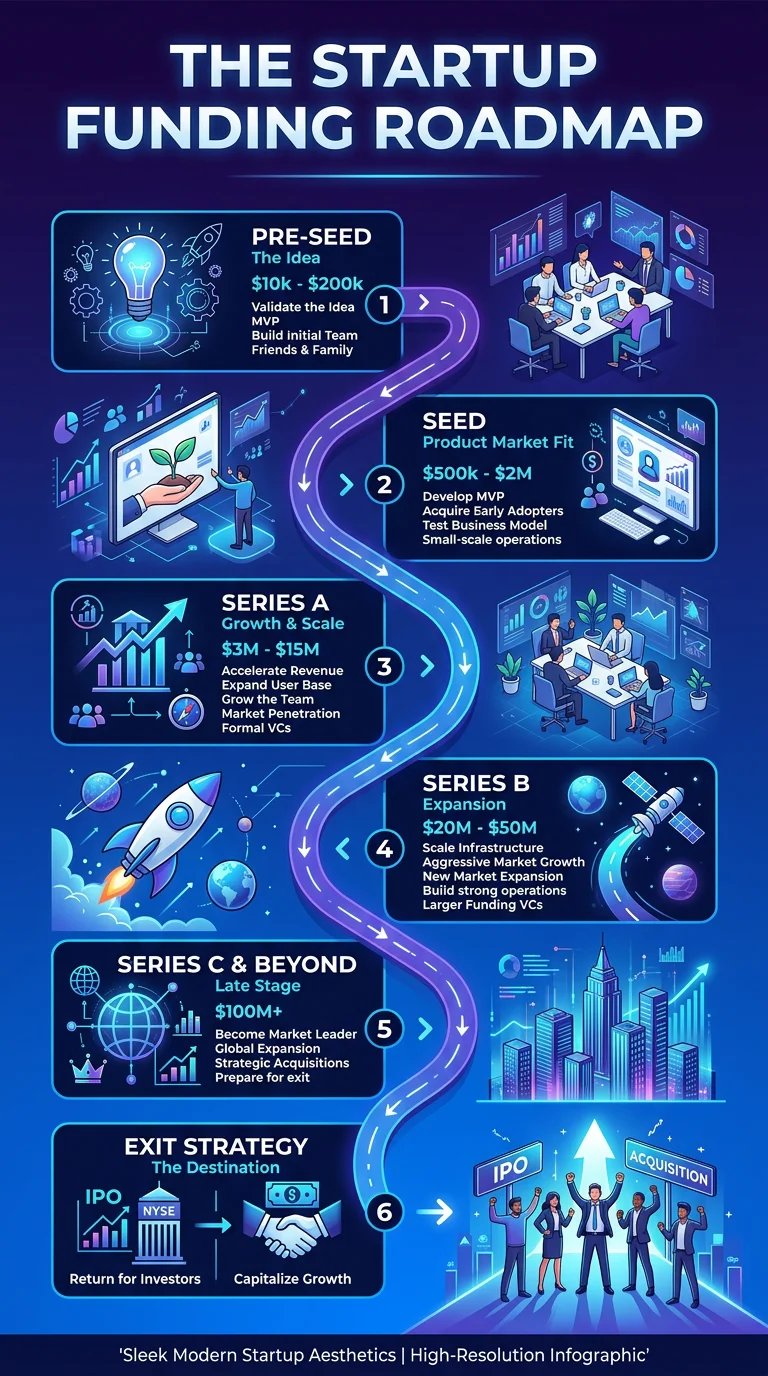 Visual roadmap from pre-seed to IPO showing typical funding amounts, equity dilution, investor types, and milestones expected at each stage