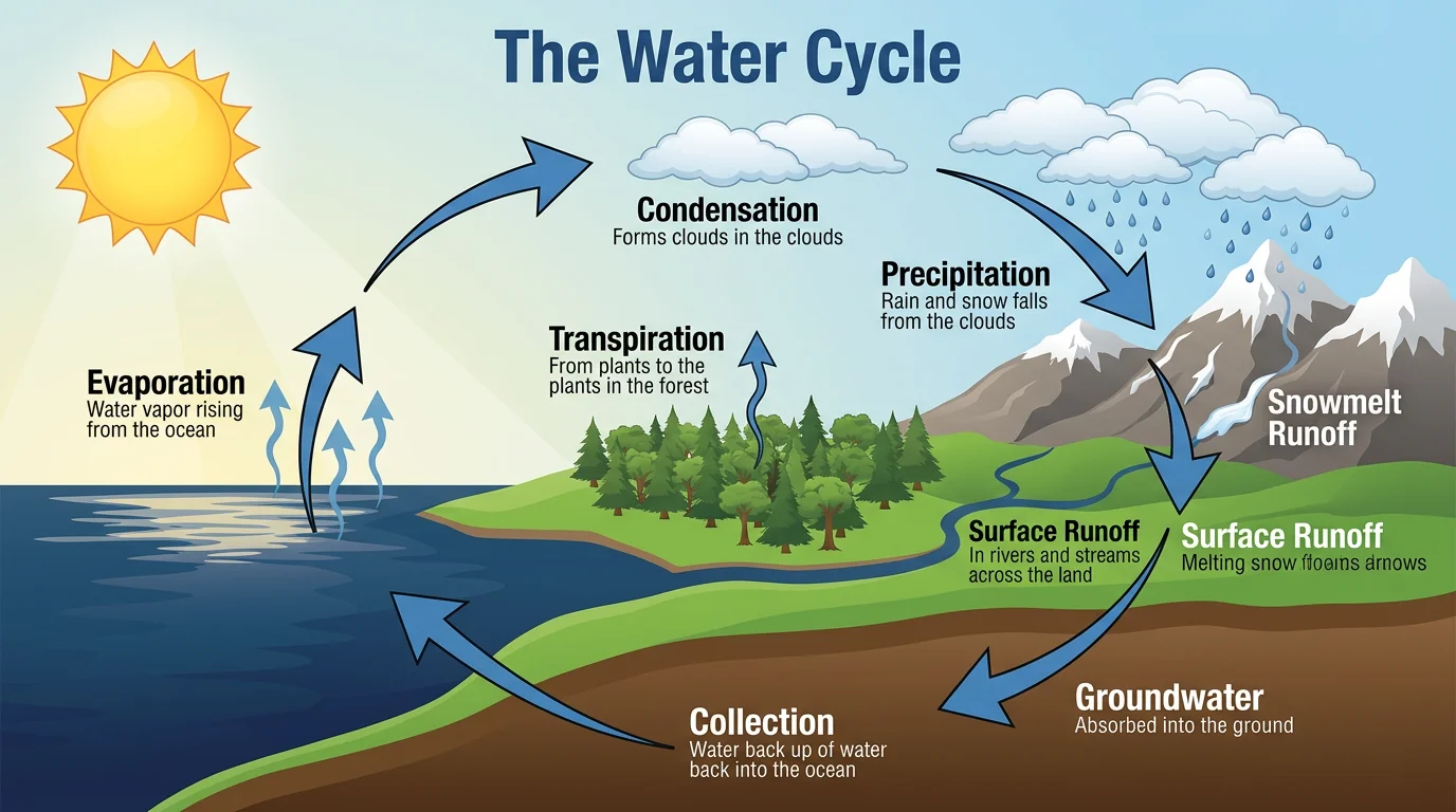 Complete visual guide to Earth's water cycle showing evaporation, condensation, precipitation, runoff, and collection with key freshwater facts