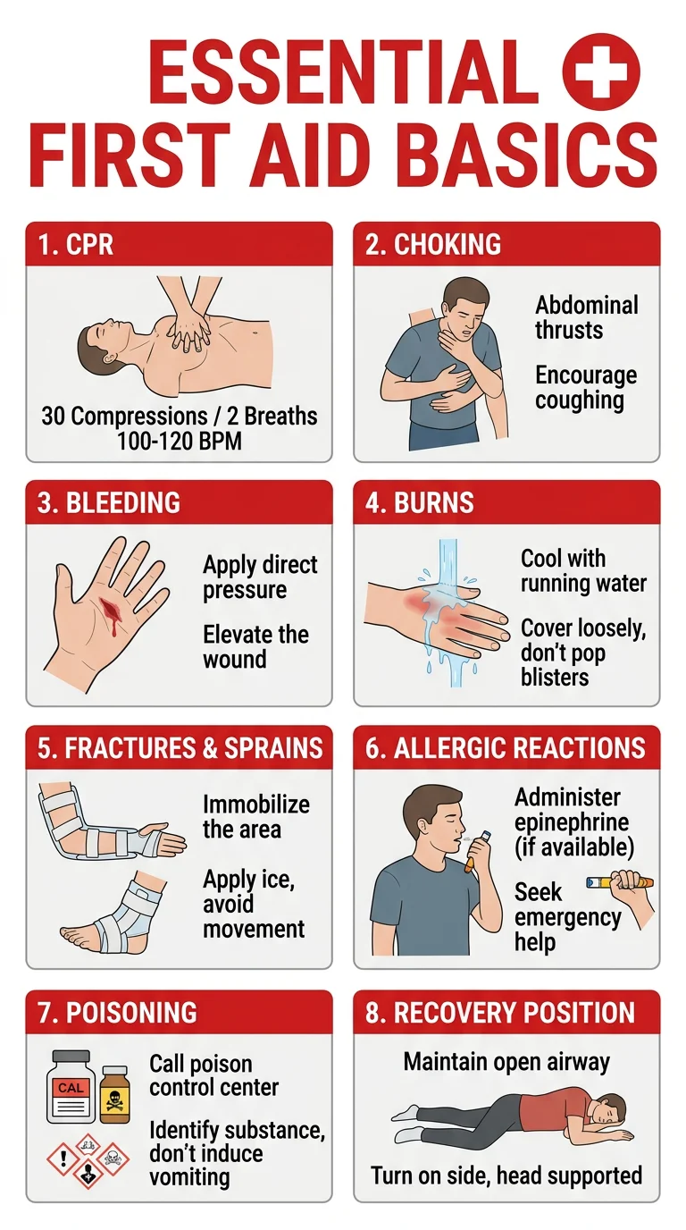 Essential first aid procedures for the 8 most common emergencies including CPR steps, choking response, burn treatment, and when to call 911