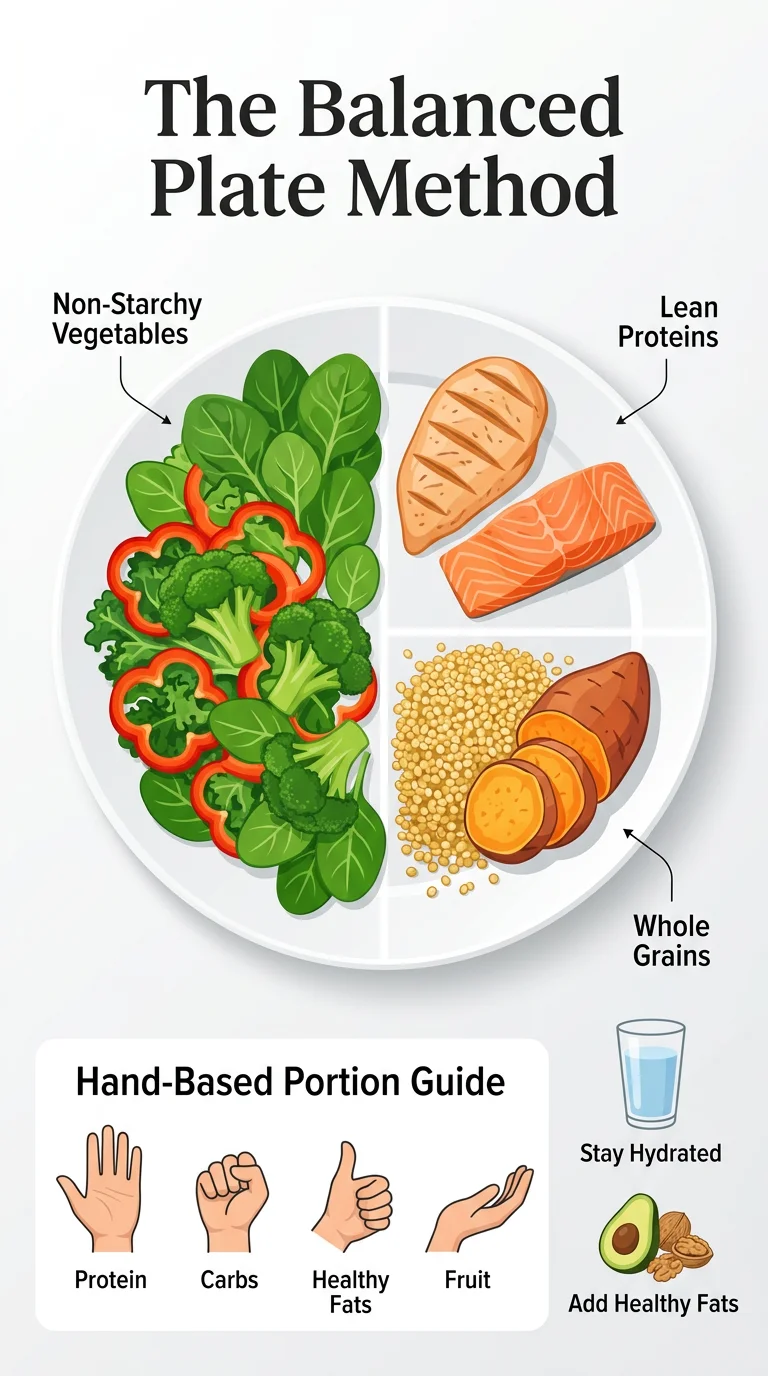 Visual guide to building balanced meals using the plate method with half vegetables, quarter protein, quarter carbs, plus portion size examples
