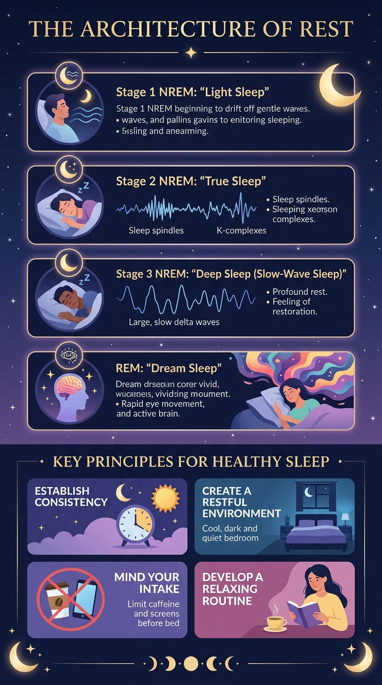 Visual breakdown of the 4 sleep stages including NREM light, NREM deep, and REM sleep with duration percentages and tips for better rest