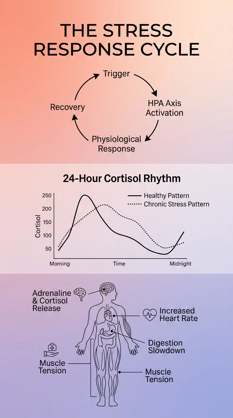 Science-backed diagram of the stress cycle showing trigger, fight-or-flight response, cortisol timeline, and 6 evidence-based recovery strategies